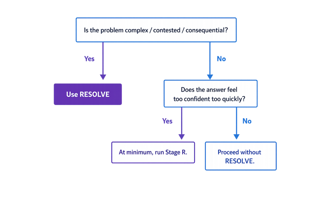 RESOLVE exists to address that. Not with a promise of clever tricks or faster outputs, but with a disciplined method for doing the harder, slower, more valuable work: understanding what is actually going on, what is actually at stake, and what would actually constitute a better outcome.